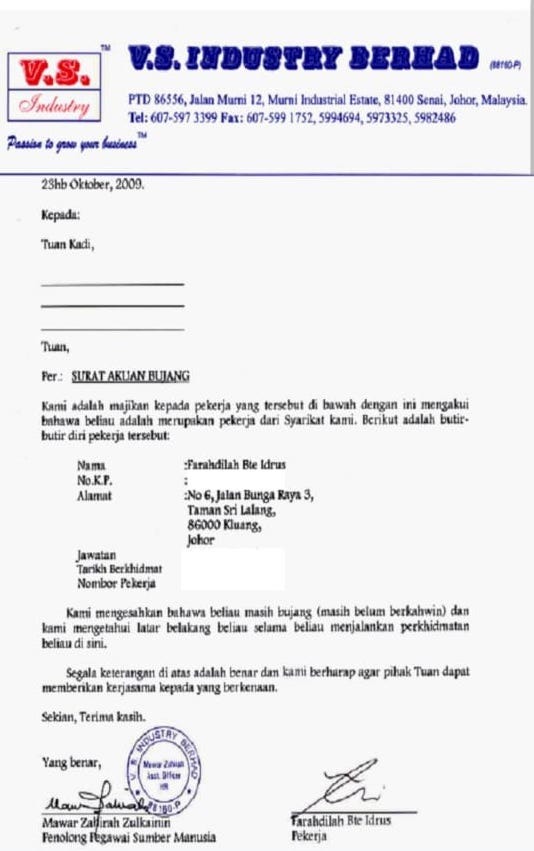 1 Single Confirmation Letter from employer or Commissioner of Oaths if self-employed for unmarried applicants;
